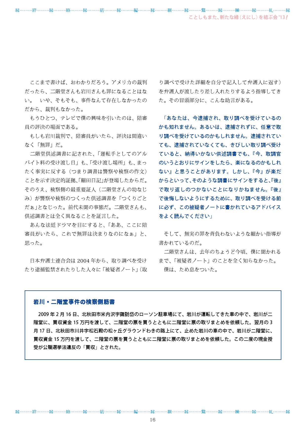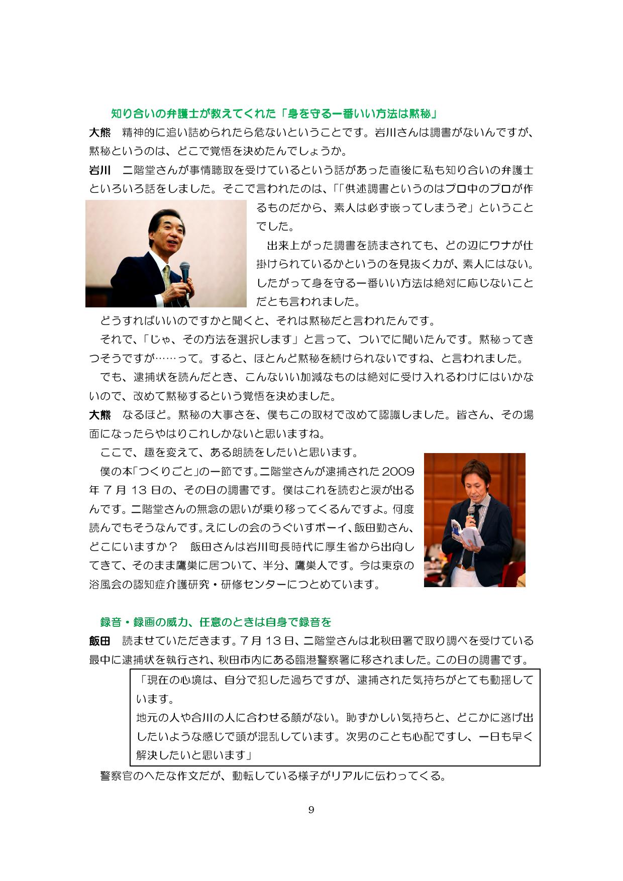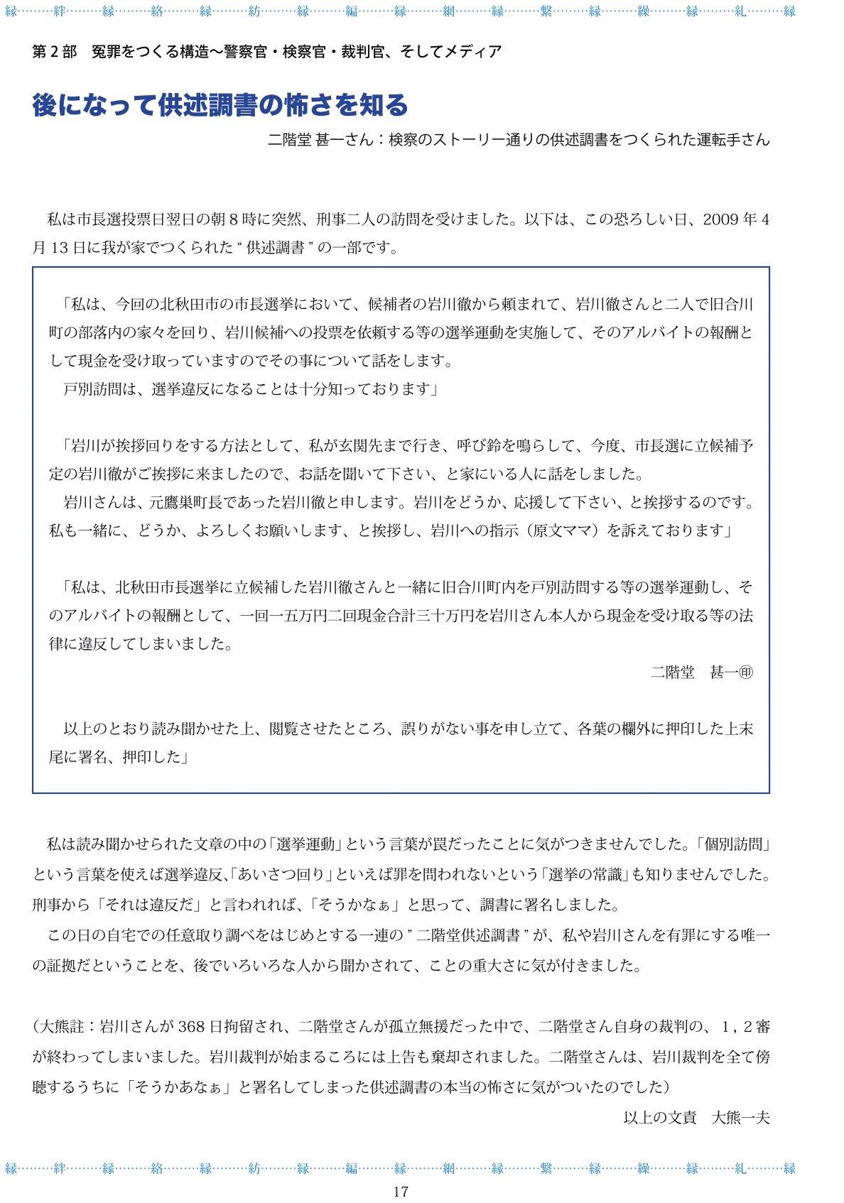 岩川さんの事件では、検察官は、二階堂さんに選挙運動と自分への投票をしてもらう報酬として、平成21年2月16日と3月17日の2回で合計30万円を支払ったと主張し、これを買収(運動買収と投票買収)として起訴しました。平成21年4月の北秋田市長選挙への立候補を表明した岩川さんが、平成21年1月に入って、合川地区のあいさつ回りや小集会に出席するための自動車運転と道案内を二階堂さんに頼み、アルバイト代として1カ月15万円のお金を2回支払ったのは事実です。しかし、そのお金は、選挙運動や投票の報酬ではなく、自動車運転と道案内という労務の対価として支払ったもので、何ら公職選挙法に違反する行為ではありません。投票日の翌日から、二階堂さんを連日取調べた警察官や検察官は、自分たちの描くストーリーに合う情報だけを示した上で二階堂さんを誘導し、二階堂さんの訂正要求にも応じないで「選挙運動や投票を頼まれた」「その報酬だと分かっていてお金を受け取った」という虚偽の供述調書に署名させました。そのため、二階堂さんは、全く事実を争わないままで、岩川さんより先に裁判を受け、昨年10月に有罪・執行猶予の判決を受けています。二階堂さんは、この判決に納得できず、1審判決に対して控訴しましたが、控訴審でも、二階堂さんは自分の言い分をほとんど聞いてもらうことができず、今年の6月15日に控訴棄却の判決を受けてしまいました。二階堂さんは、現在、最高裁に上告しています。私たちは、岩川さんの弁護人になってから約2ヵ月の間に、その二階堂さんから詳しい事情の聞き取りを行ったところ、二階堂さんは、警察官や検察官に誘導によって隠されてしまった重要な事実を思い出してきました。その事実とは、お金を受け取った時期が起訴された時期ではなく、岩川さんの主張している時期に近いことでした。そして、受け取ったお金は、自動車運転と道案内のアルバイト代で、岩川さんから選挙運動や投票を岩川さんから依頼されたことはないと、自信を持って言い切ったのです。