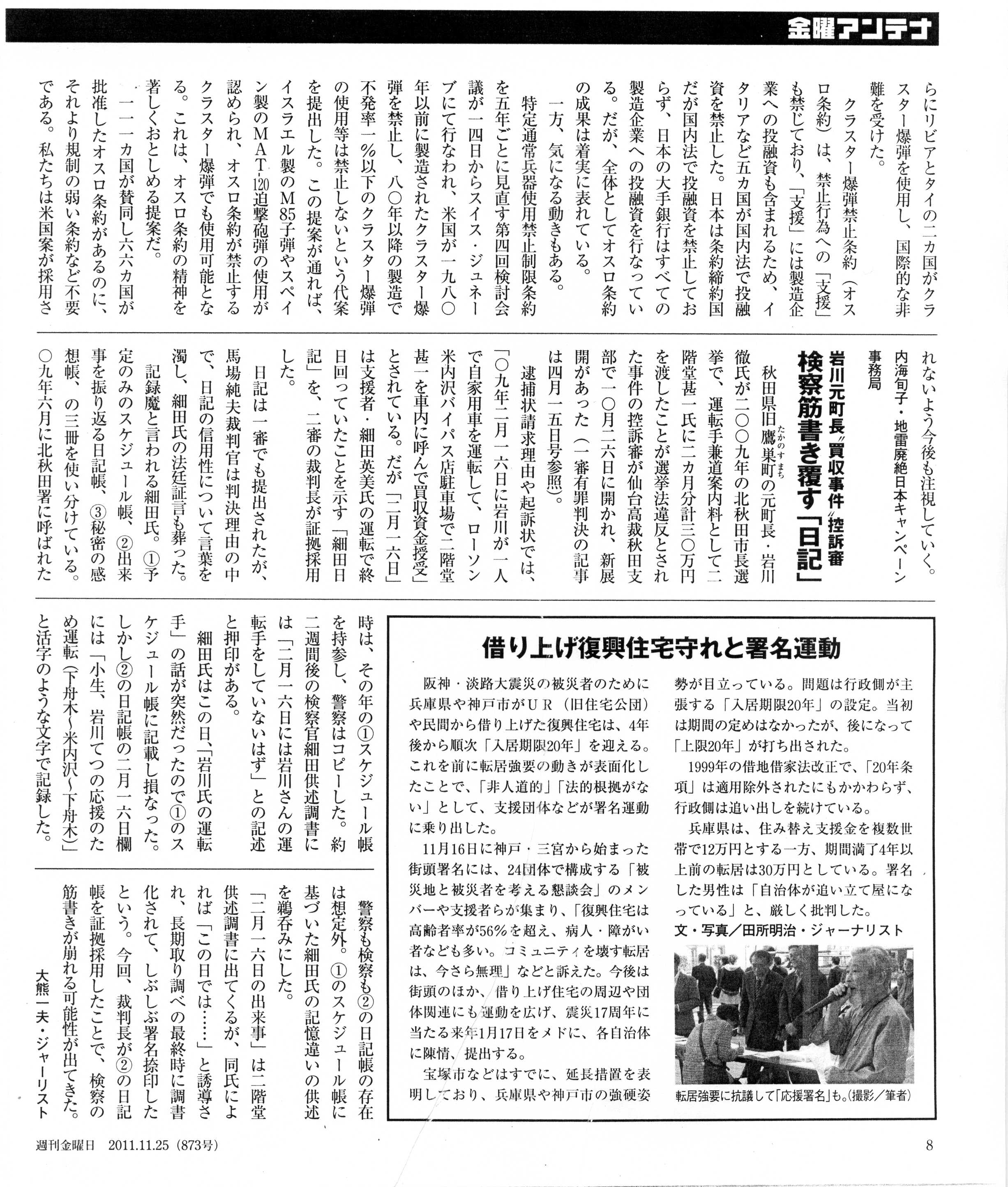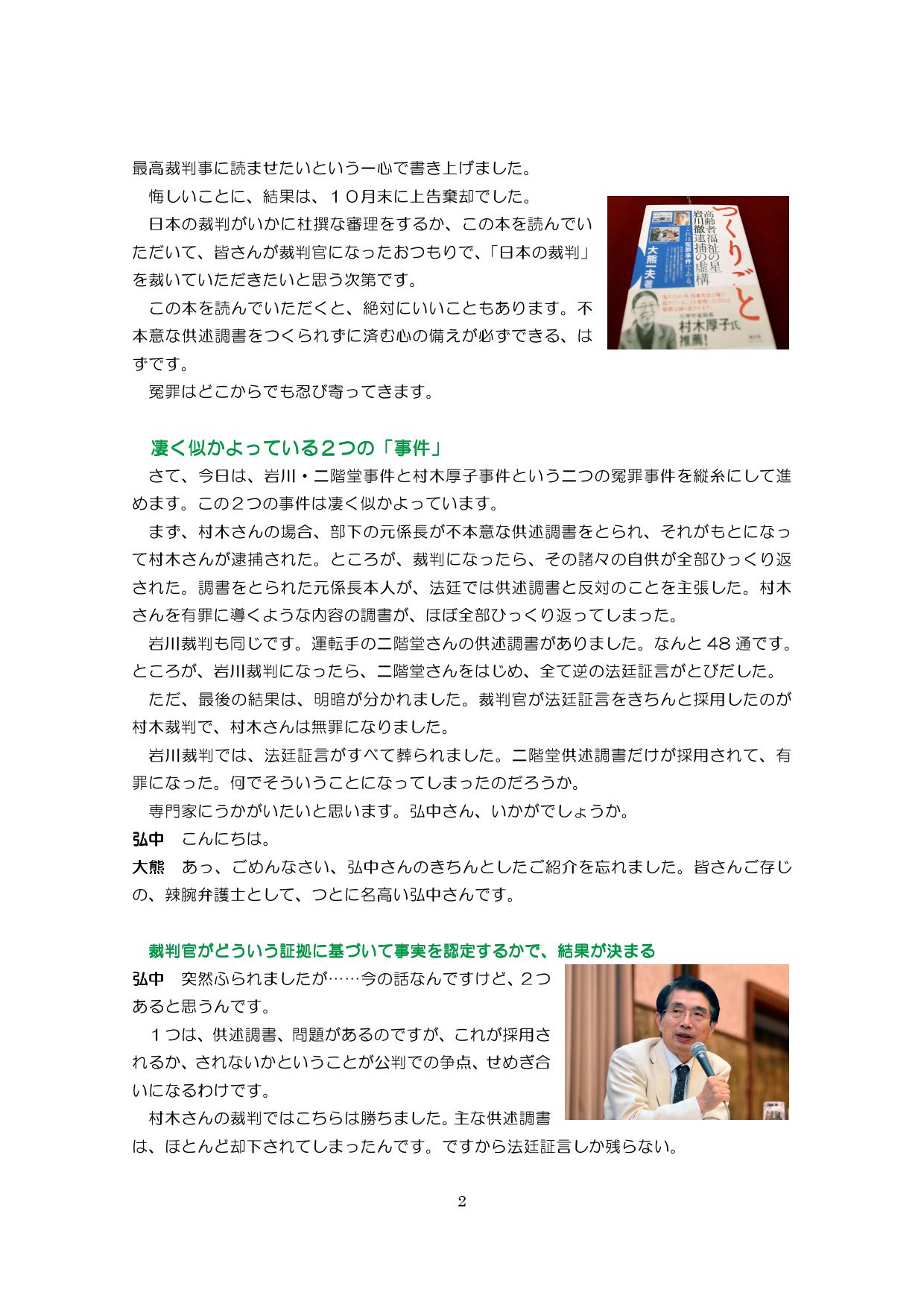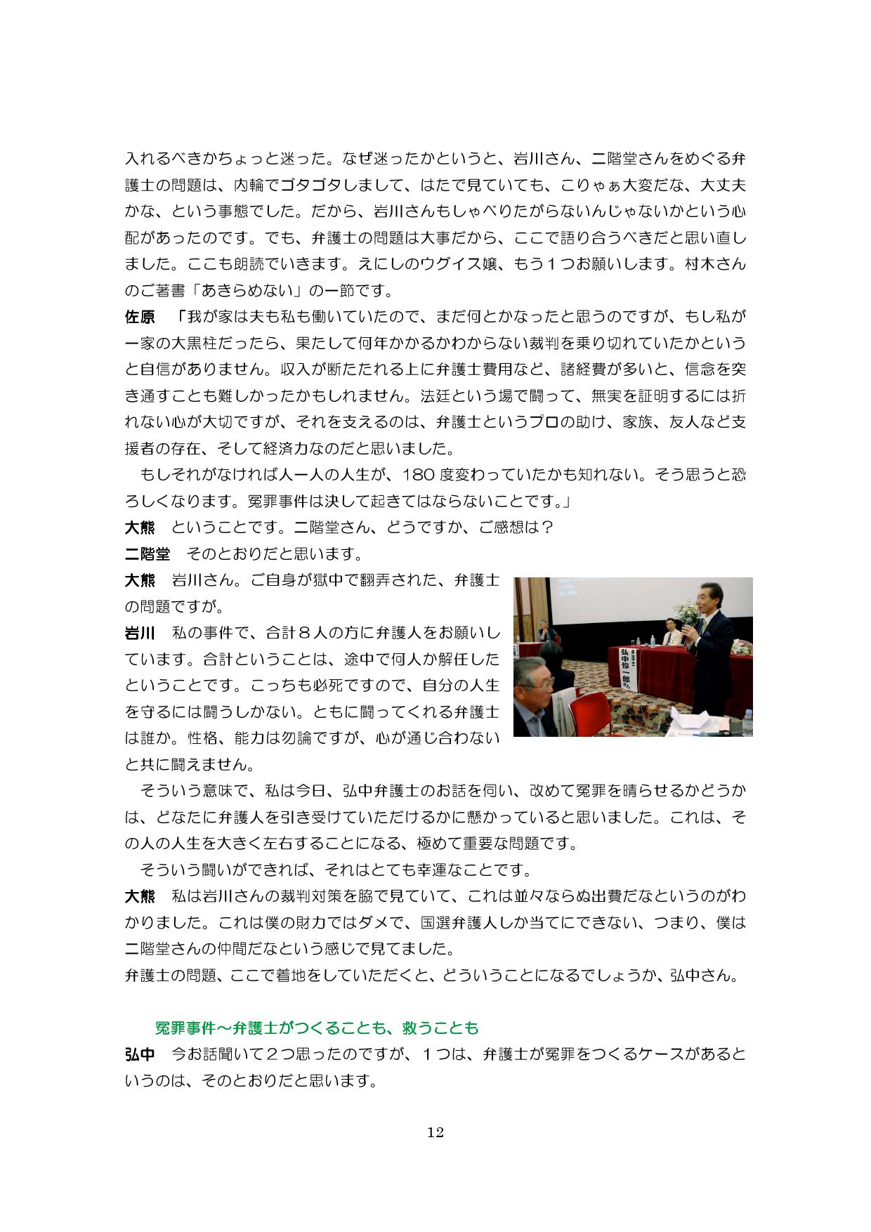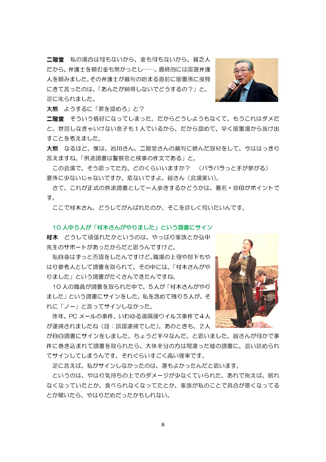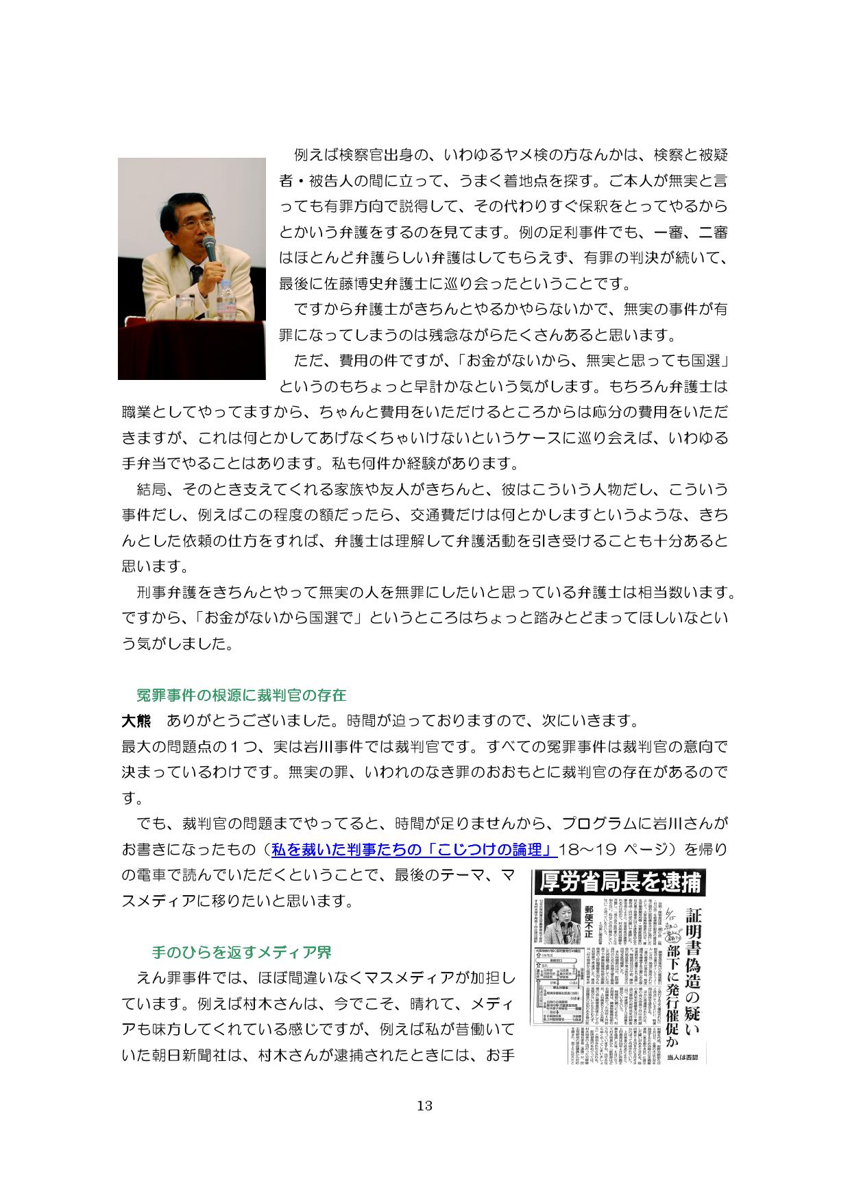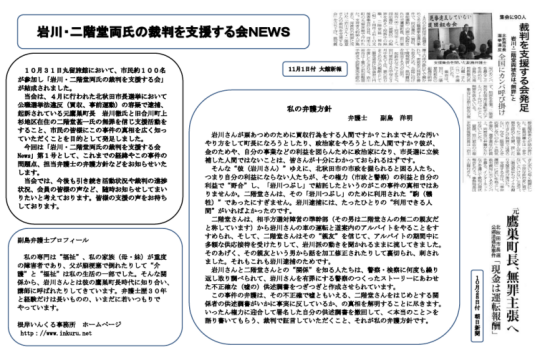 ところで、警察・検察のつくりあげた有罪の証拠を崩し、無罪となる証拠をみつけ、つくっていく作業(弁護活動)は本当に苦労しますが、東京から秋田まで月に何日間かをつぶす弁護の旅費・日当だけでも高額になります。そこで、急ぎ記者会見をなし、地元で「岩川・二階堂両氏の裁判を支援する会」をたちあげました。2つの裁判(二階堂さんは1審有罪をくつがえす控訴審、岩川さんはこれからはじめる第1審裁判)を無罪としてやり抜くには、それは相当額の弁護費用がかかります。そこで、私のところの人権センター基金の皆さんにもお知らせし、この支援要請を広く周知してカンパを集めることにしました。(東京から大石弁護士も、できるところで手伝ってくれることになっています。)