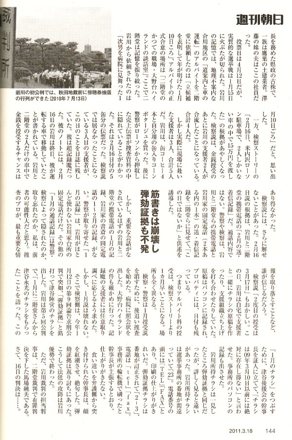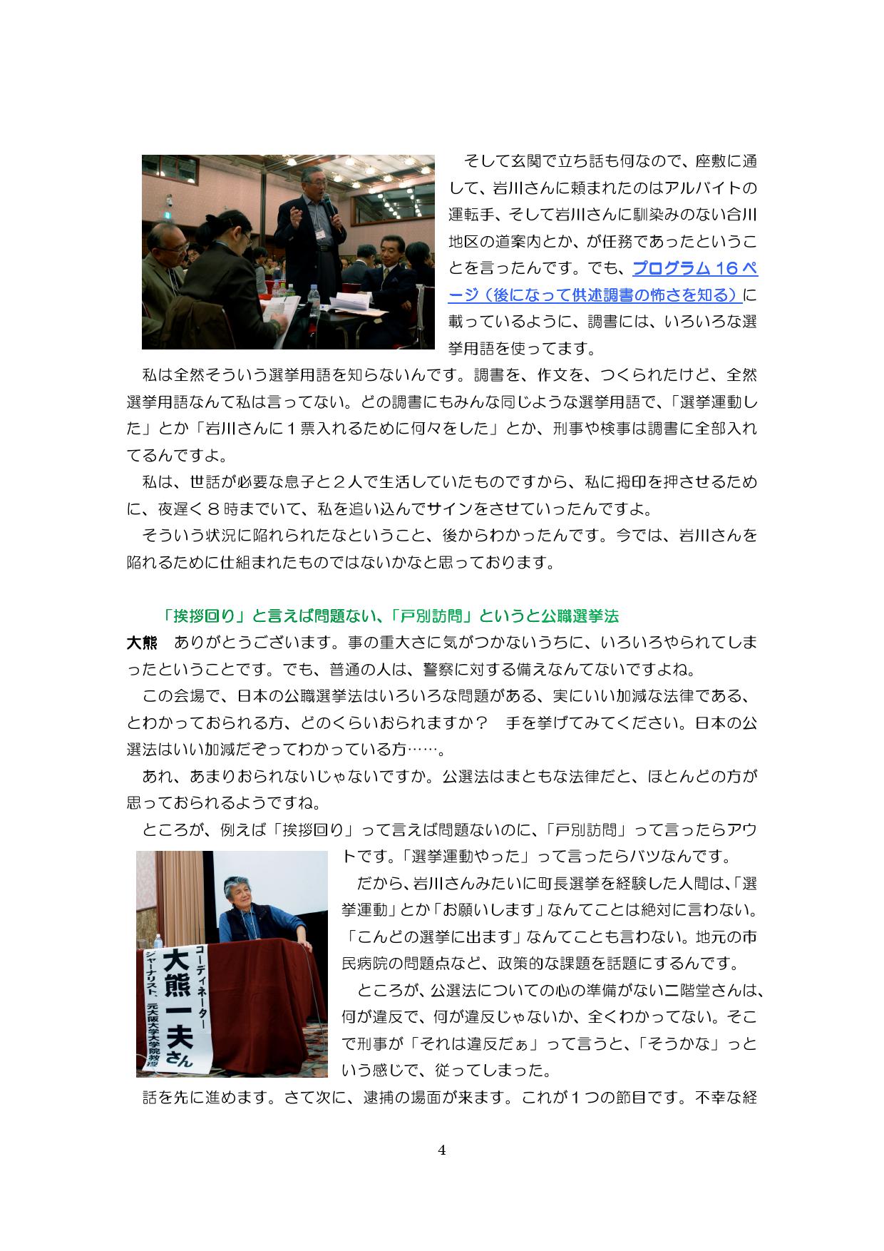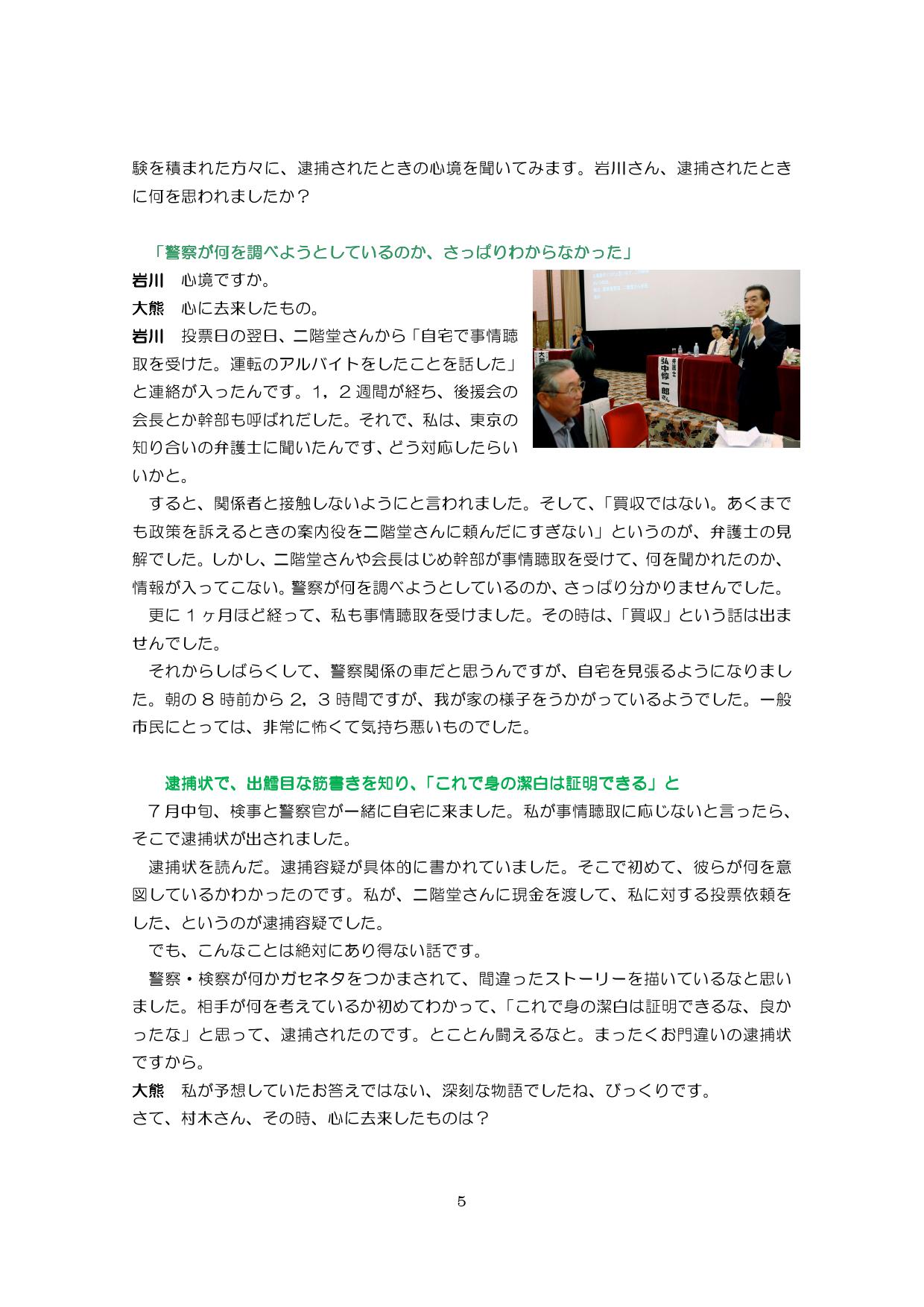 私は、この北秋田市長選投開票日の翌日(岩川さん落選)の4月13日の夜、二階堂さんと、二階堂さんを運転手(道案内)のアルバイトとして岩川さんに紹介したKさんの2人から、「岩川さんの選挙違反の容疑で呼びだしがあり、朝から夜まで聞かれた。どういうことなんだ。」という相談(電話)を受けました。それから4~5回、警察からの呼びだしと取調べのあと、私がその取調べの内容を聞き、事実関係をはっきりと説明するよう助言してきていました。そして、私は二階堂さんと岩川さんの2人から事情聴取をして、2人の関係は、岩川さんが知らない地区の道案内をするためにアルバイトの運転手として契約(雇用)したことをはっきり聞いてきました。