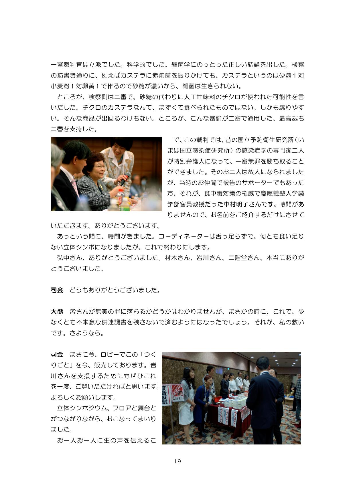 私たちは、岩川さんと一緒に、油断することなく確実に無罪判決を獲得できるように頑張る決意です。岩川さんは、皆さまの温かいご支援を心の支えにして、1年を超える拘禁生活を乗り切ってきました。これからも、岩川さんと二階堂さんの裁判に、一層のご支援をお願いする次第です。