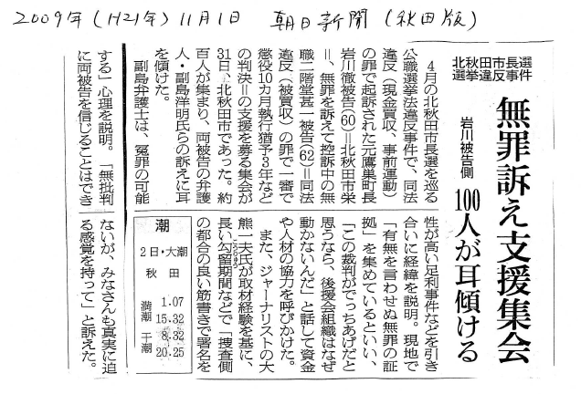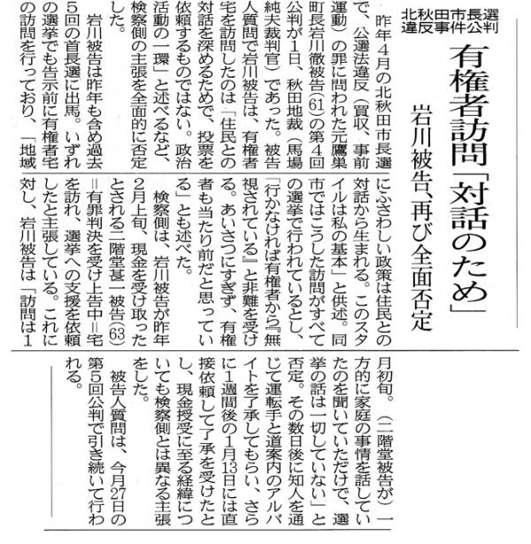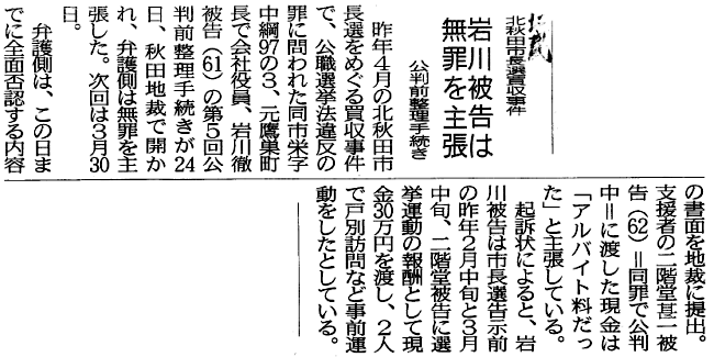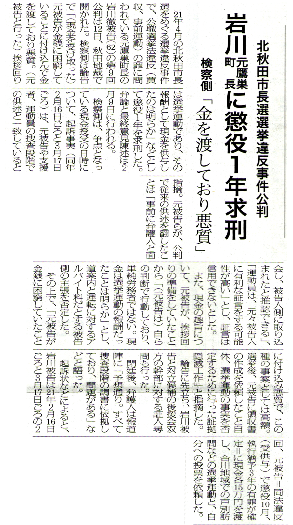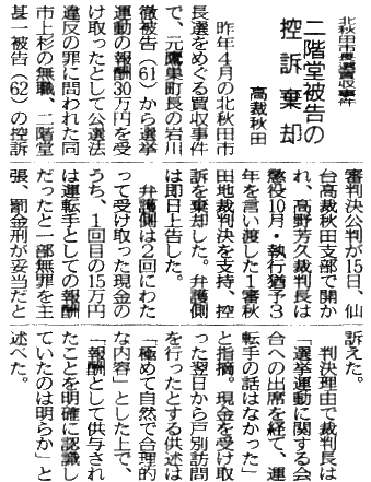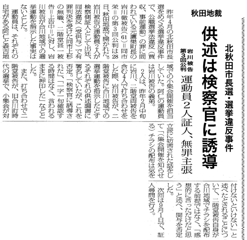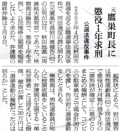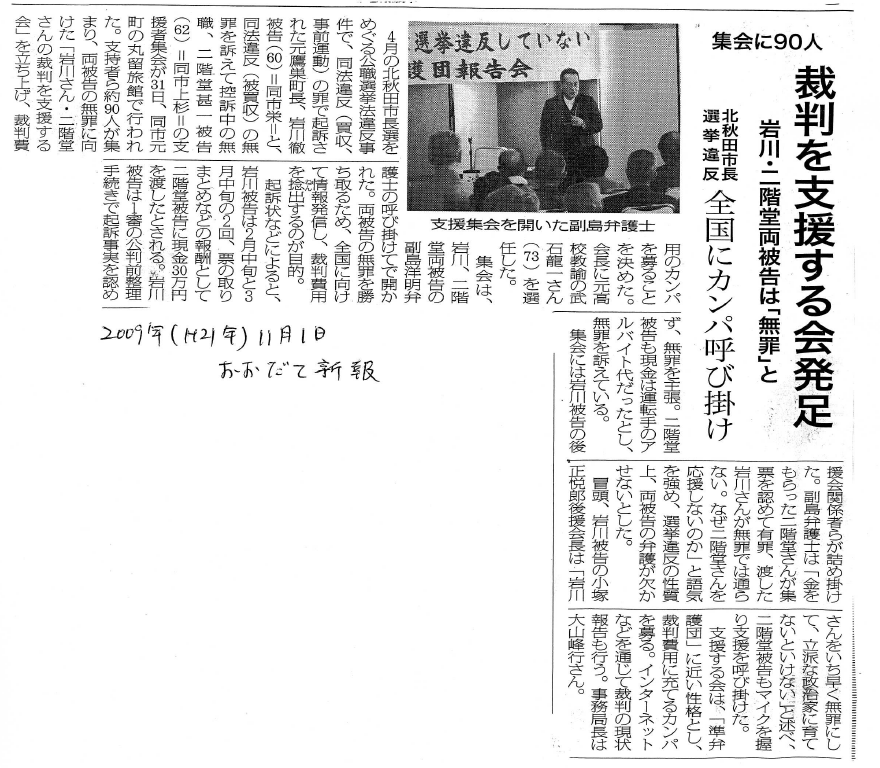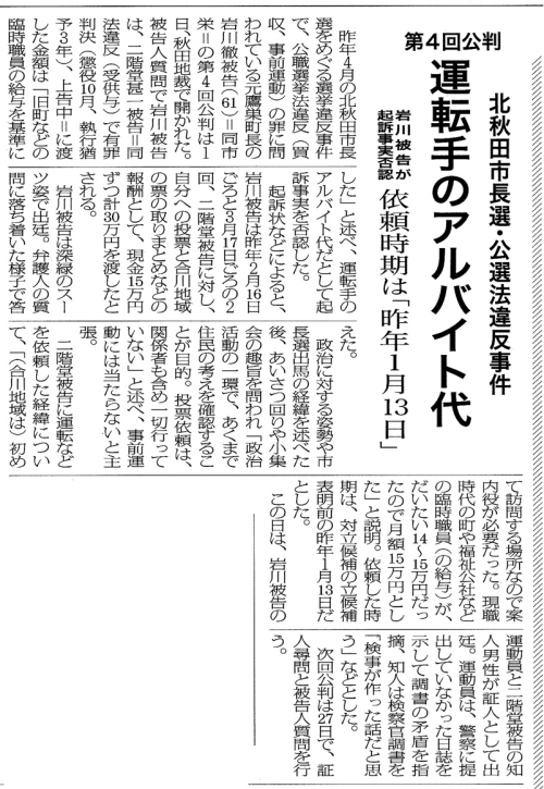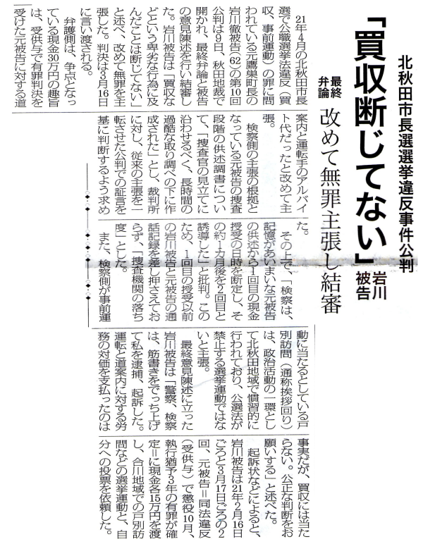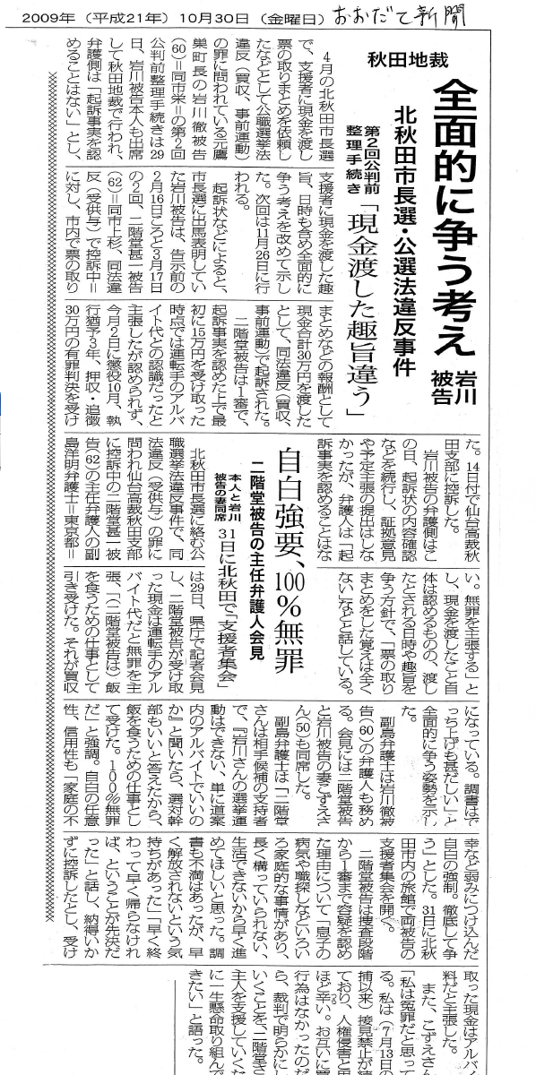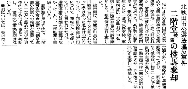 本件は、岩川氏が初めての北秋田市全域の市長選挙に臨むに当たり、旧合川町の地理に不慣れだったこともあり、挨拶回りの際の運転手並びに道案内役として、知人を介して二階堂氏にアルバイトとして協力を依頼し、その給与として現金を支払ったものでありますが、警察および検察は、取り調べ当初より一貫して、「票の取りまとめのための買収行為」と決めつけ、秋田地裁も10月2日に二階堂氏に対し、懲役10ヶ月 執行猶予3年の有罪判決を下しました。