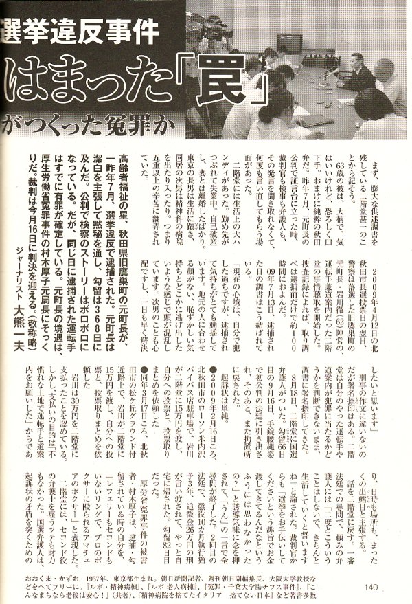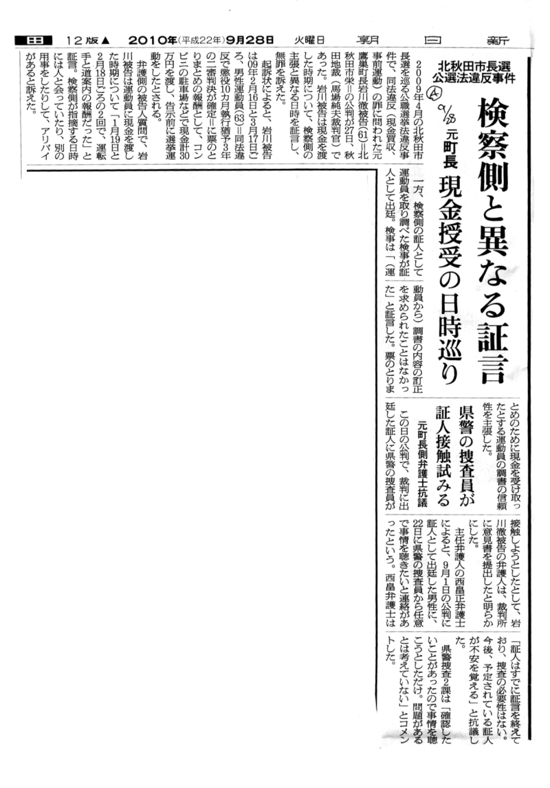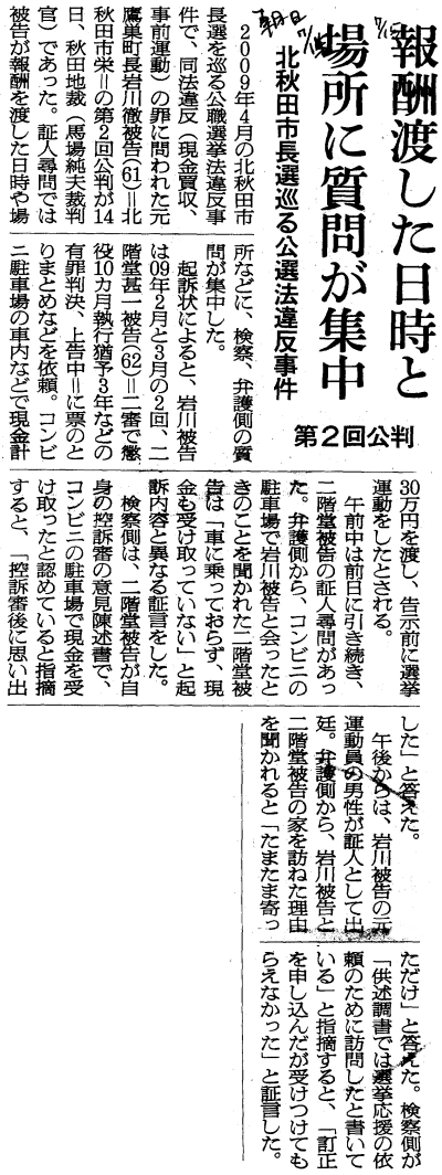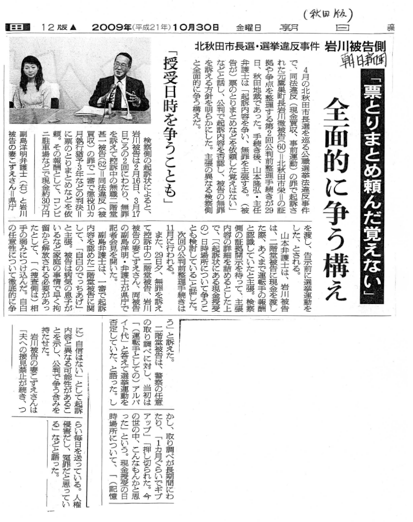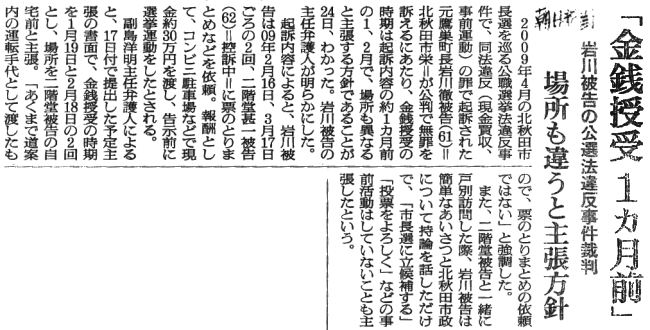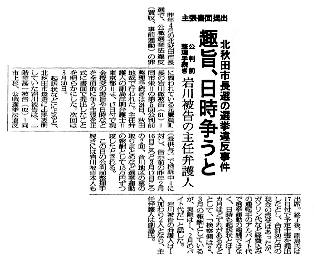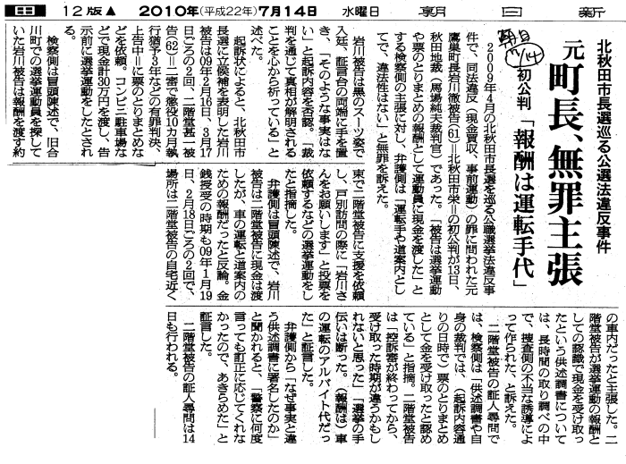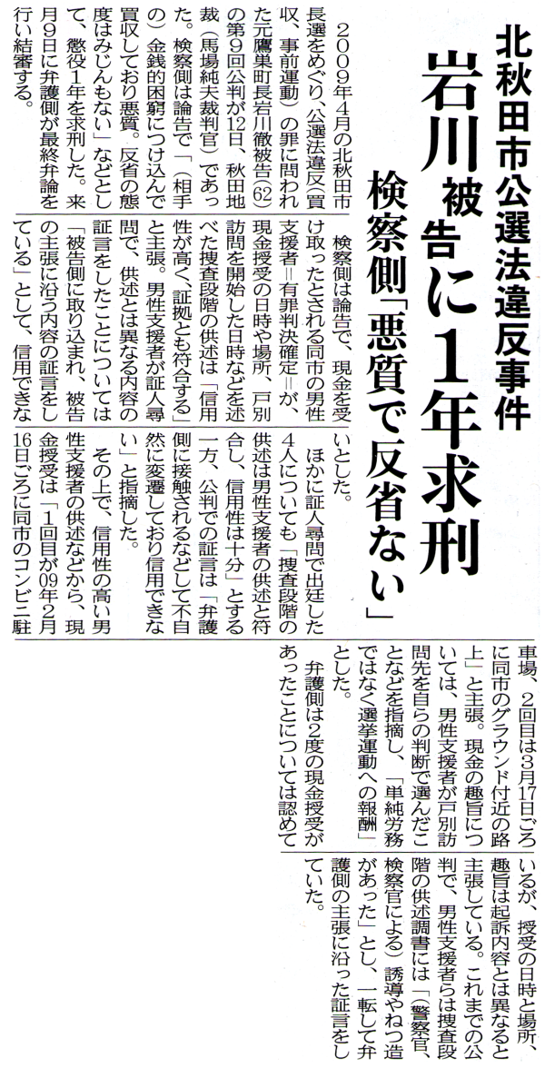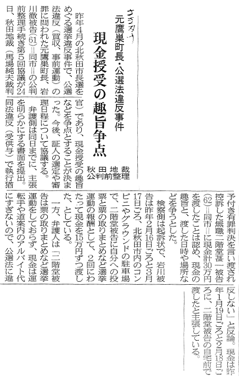 本件は、岩川氏が初めての北秋田市全域の市長選挙に臨むに当たり、旧合川町の地理に不慣れだったこともあり、挨拶回りの際の運転手並びに道案内役として、知人を介して二階堂氏にアルバイトとして協力を依頼し、その給与として現金を支払ったものでありますが、警察および検察は、取り調べ当初より一貫して、「票の取りまとめのための買収行為」と決めつけ、秋田地裁も10月2日に二階堂氏に対し、懲役10ヶ月 執行猶予3年の有罪判決を下しました。