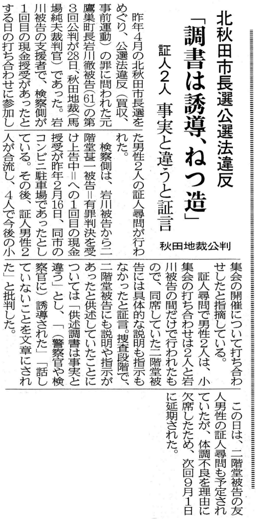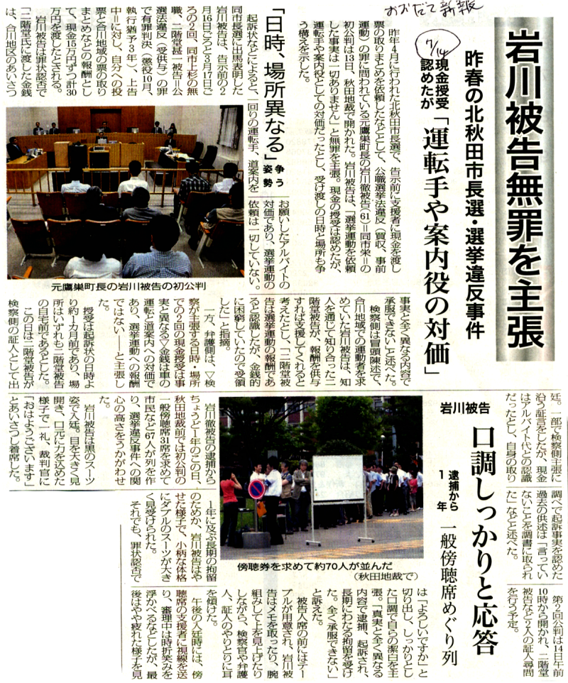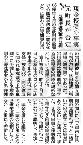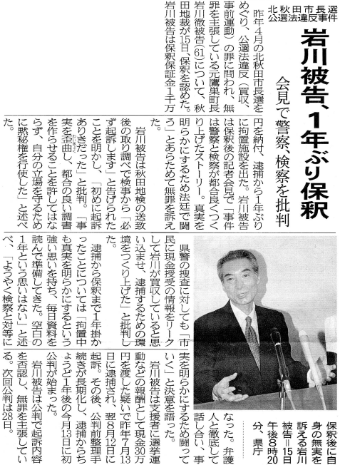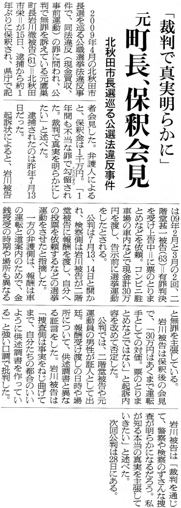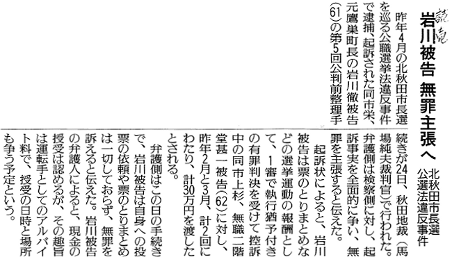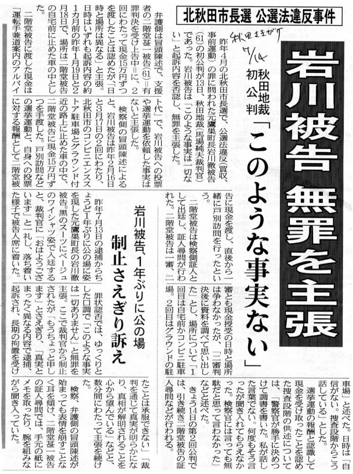 さて、本年4月に行われた秋田県北秋田市長選挙に関連し、7月13日に公選法違反(現金買収など)の疑いで元鷹巣町長 岩川徹氏と二階堂甚一氏が逮捕拘留されてから、はや4ヶ月が経過しております。