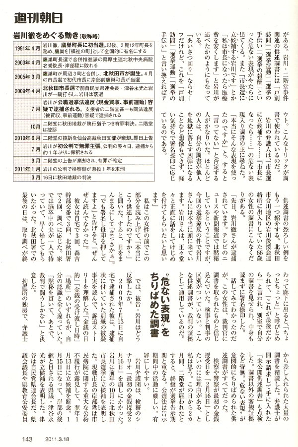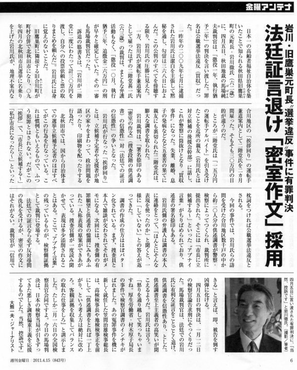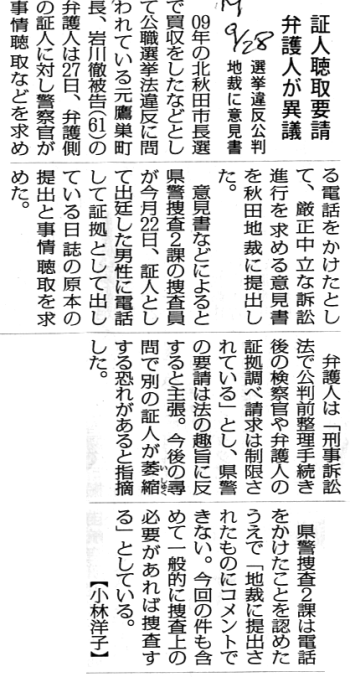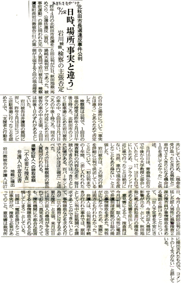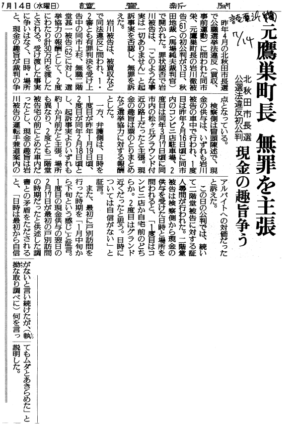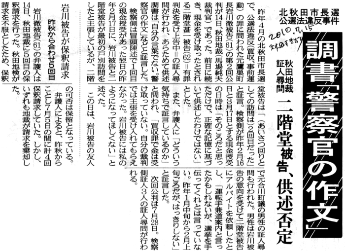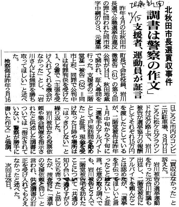 さて、本年4月に行われた秋田県北秋田市長選挙に関連し、7月13日に公選法違反(現金買収など)の疑いで元鷹巣町長 岩川徹氏と二階堂甚一氏が逮捕拘留されてから、はや4ヶ月が経過しております。